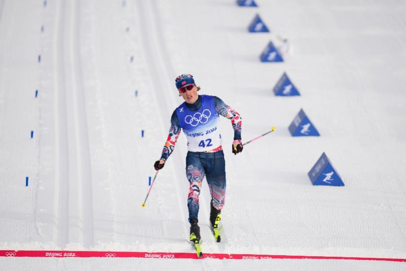 2022年2月11日,北京冬奥会越野滑雪男子15公里(传统技术)比赛,挪威选手约翰内斯·赫斯弗洛特·克莱博在比赛中冲线。新华社发